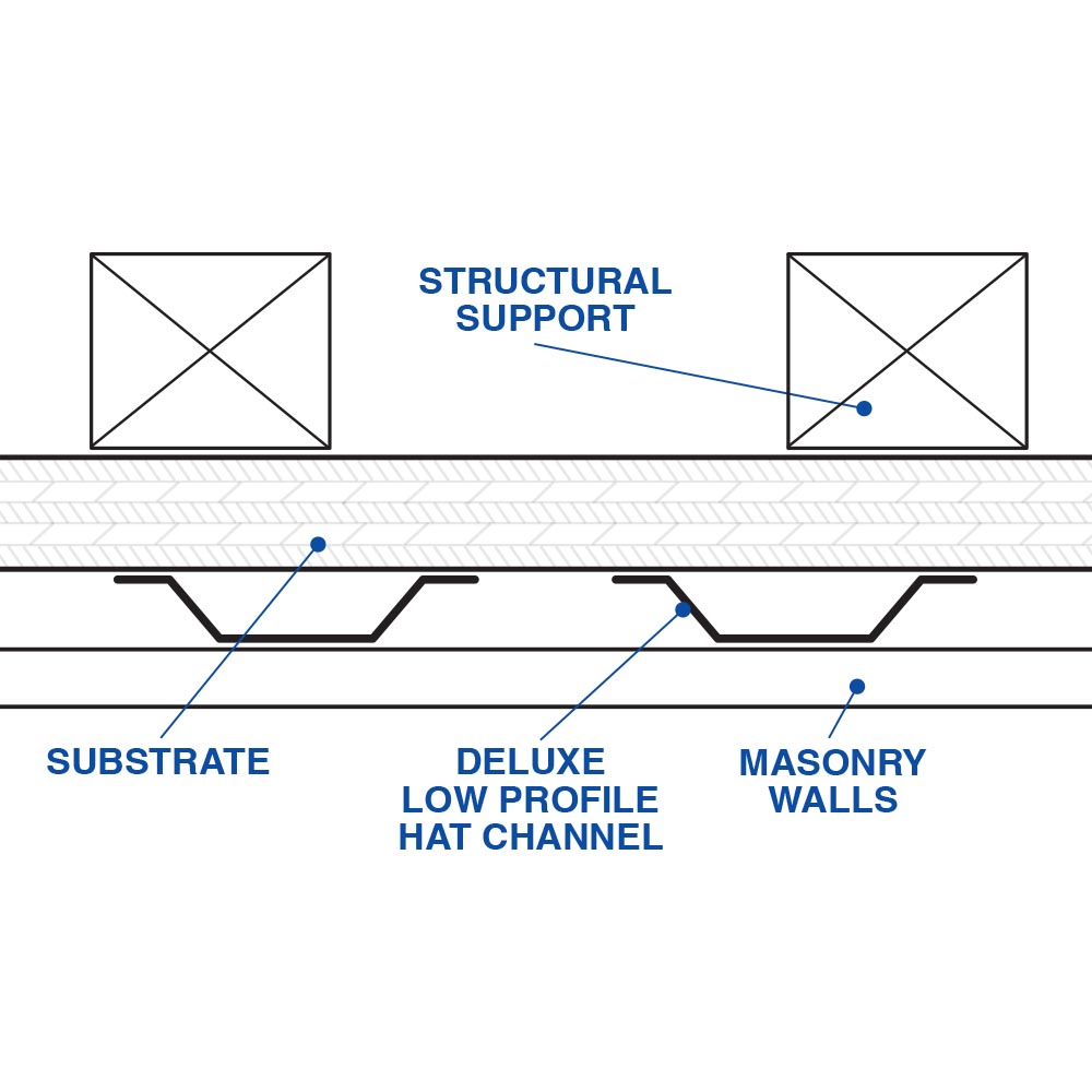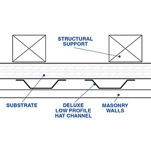 The Deluxe Low Profile Hat Channel is designed to give less spacing. These 110 degree Hat Channel are framing components used to space out masonry walls and ceiling assemblies. In concrete wall applications, furring channel is installed vertically to the wall surface using concrete nails or power-driven fasteners. Exterior panels are then attached to the hat channels.