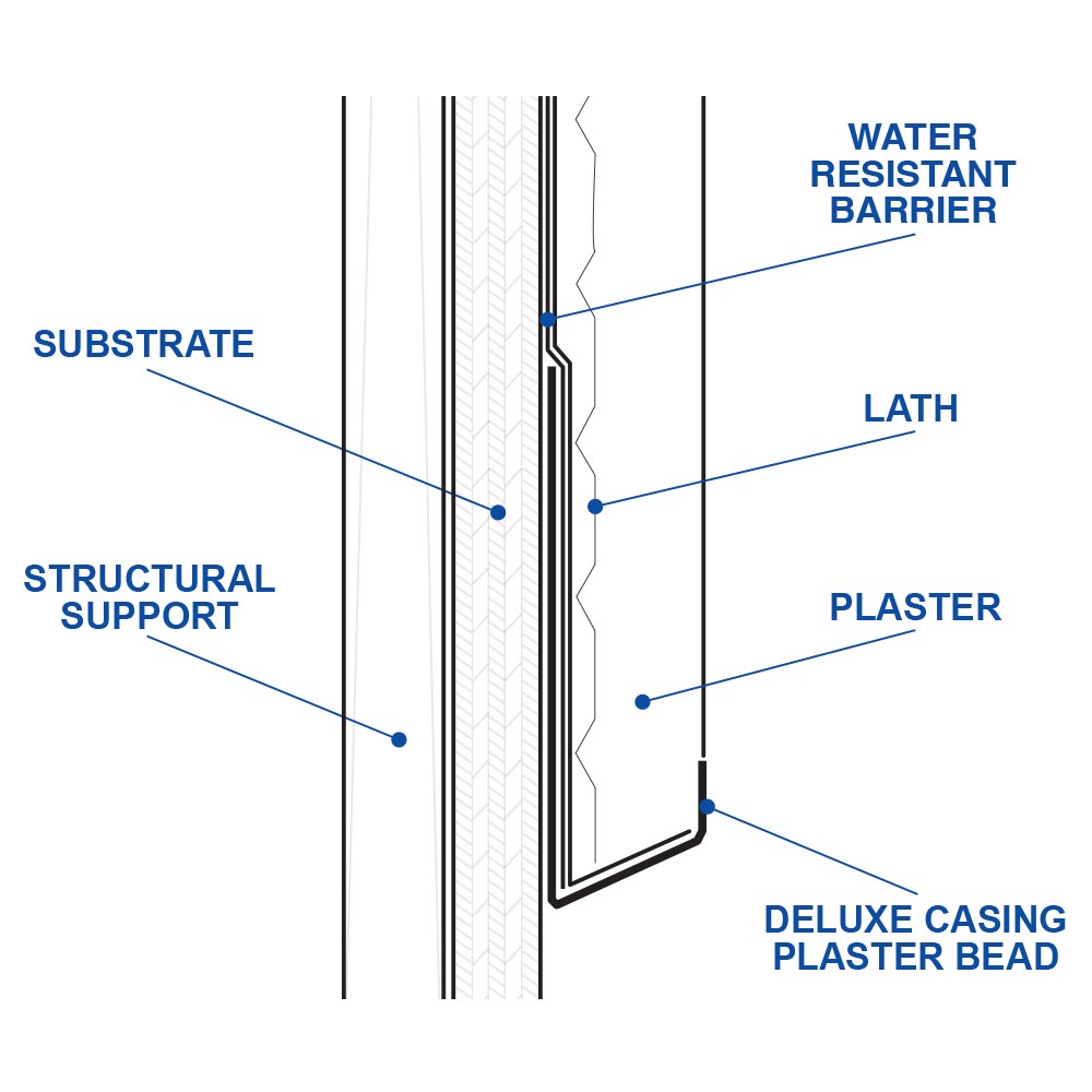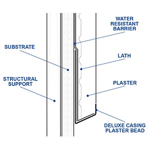 The Deluxe Casing Plaster Bead is a stop/casing bead used to terminate the stucco at the base of walls and/or where a plaster stop is required. Has a 60° angle which creates a unique look.