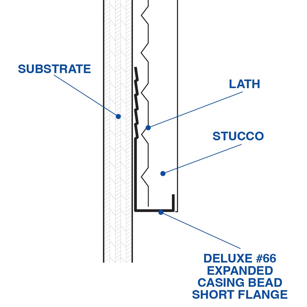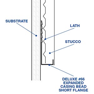 Deluxe #66 Expanded Casing Bead Short Flange is a 90 degree for use in plastered finish edges and corners or when adjoining dissimilar material. Absorbs movement due to expansion and contraction of plastered walls. Provided with an expanded flange for proper keying and easy application.