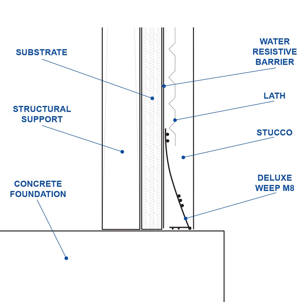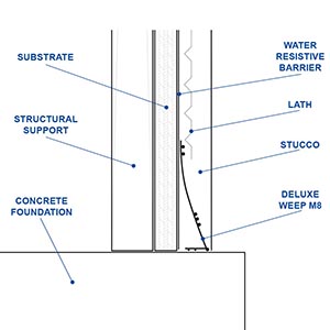 The Deluxe Weep M8 acts as a foundation screed for conventional 3-coat 7/8" stucco. These expands the weep area to helps prevent your stucco from staining or cracking. Allows any moisture that gets behind the stucco to drain.