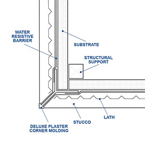 The Deluxe Plaster Corner Molding is used to creates a plaster stop and high strength corner for conventional 3-coat stucco with an aesthetically pleasing exposed edge at all outside corner.