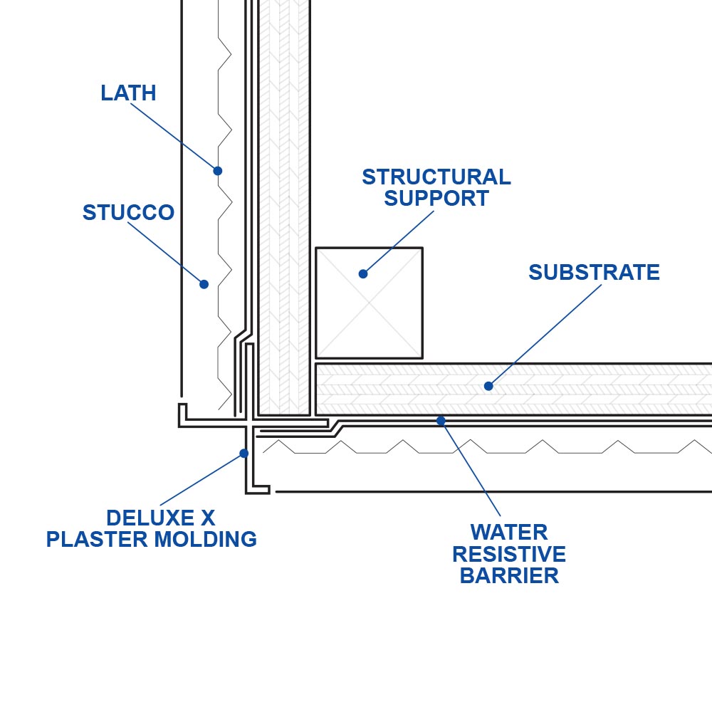 The Deluxe X Plaster Molding creates a visually pleasing inverted corner reveal detail for conventional 3-coat stucco at fascia or soffit conditions and around recessed entryways and doors. Can also be used to trim off the tops of pony walls and used as a drip edge on a fascia or soffit condition.