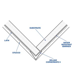 The Deluxe CornerMate II is made with two nailing flange with on both sides. Featuring three nose wire, used for exterior corner reinforcing with conventional 3-coat 7/8" stucco.