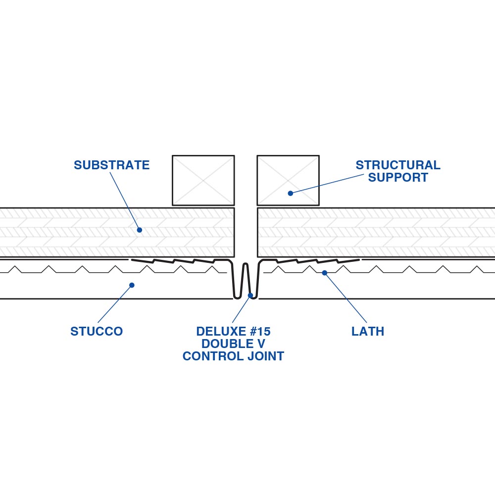 The Deluxe #15 Double V Control joints are used to relieve stresses in large plaster walls and ceilings. This inconspicuous profile provides stress relief and finishing point for the top color coat. This product has expanded flanges on both sides for proper keying of the scratch and brown coat.