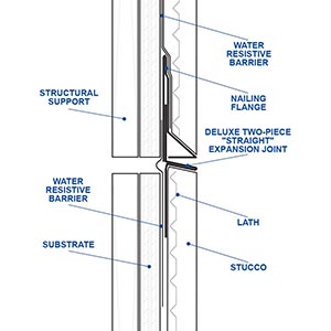 The Deluxe Two-Piece "Straight" Expansion Joint is made for application where movement is anticipated. The self aligning two piece design allows for 1" of vertical movement while maintaining a watertight assembly for plaster walls. These two pieces allow moisture drainage from the top and lock out moisture from the bottom.