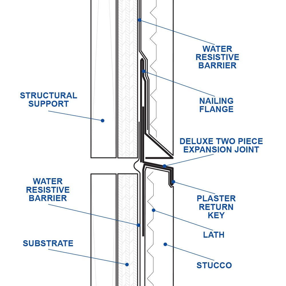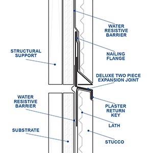 The Deluxe Two-Piece Expansion Joint is made for application where movement is anticipated. The self aligning two piece design allows for 1" of vertical movement while maintaining a watertight assembly for plaster walls. These two pieces allow moisture drainage from the top and lock out moisture from the bottom. Features a plaster return key on the bottom leg.