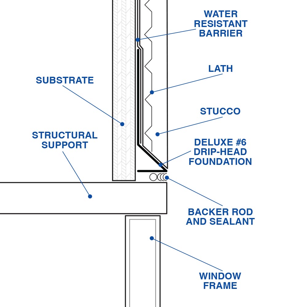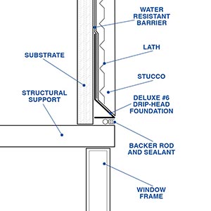 The Deluxe #6 Drip-Head Foundation is in an angles drip screed that can be used at base of walls. It may also be used as a window or door head plaster stop and flashing piece.
